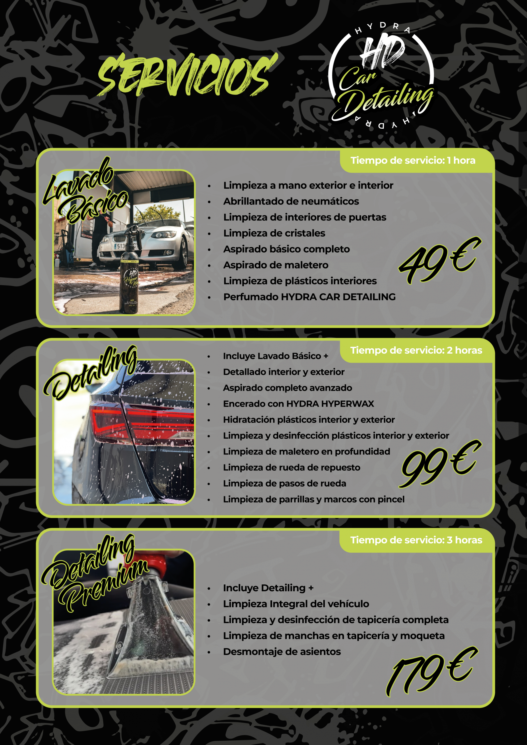 En Hydra Car Detailing trabajamos con servicios ajustados a lo que de verdad importa. Estos son los pilares de nuestro detailing básico, ideal para coches de uso diario que buscan estar impecables sin postureo.
